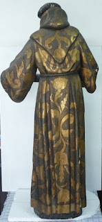 Durante el proceso de limpieza de la encarnadura( cabeza y manos), con la consiguiente eliminación de repintes, observamos un tipo de ensamble de dichas piezas al cuerpo, que, unidas a la evidente diferencia de calidad artística existente entre el estofado y las encarnaduras, nos hace pensar que las manos y la cabeza no son originales de ese cuerpo, tratándose probablemente de la adaptación de dos obras distintas para configurar el aspecto iconográfico actual. Vemos así un riquísimo estofado que destaca por la profusión de amplios elementos vegetales, así como por el empleo de una amplia gama de técnicas de estofado( rayado, esgrafiado,...), además de una riqueza cromática muy viva. Un estofado que por otra parte es visible también en el reverso de la obra, aspecto extraño en obras concebidas originalmente para Retablo.